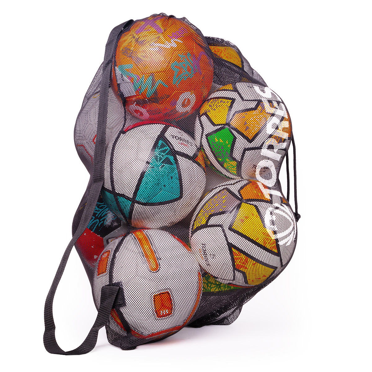 Вместимость сетки составляет до 10 футбольных/волейбольных мячей или 7 баскетбольных в зависимости от размера.